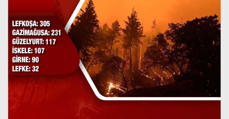 Açıklamaya göre, yangınların 305’i Lefkoşa, 231’i Gazimağusa, 90’ı Girne, 117’si Güzelyurt, 107’si İskele ve 32’si Lefke’de meydana geldi.