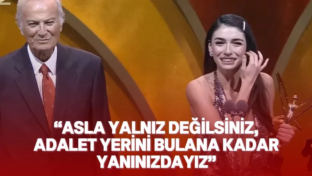 Ediz Hun’un ödülü takdim etmesinin ardından Hazar Ergüçlü, ödülünü almak üzere sahneye çıktı ve konuşmasına şöyle devam etti: “Hepiniz hoş geldiniz, sevgili jüri üyelerine, halkımıza çok teşekkür ederim. Çok mutluyuz, gördüğünüz gibi herkes yer içer hesabı Dilber öder, buraya da ödülü almaya ben geldim. Tüm ekip burada olmak istedi ancak set devam ediyor bu yüzden maalesef ben tek başıma katılabildim. Çok teşekkür ederiz tekrar, bu değerli ödülü bize layık gördüğünüz için.”