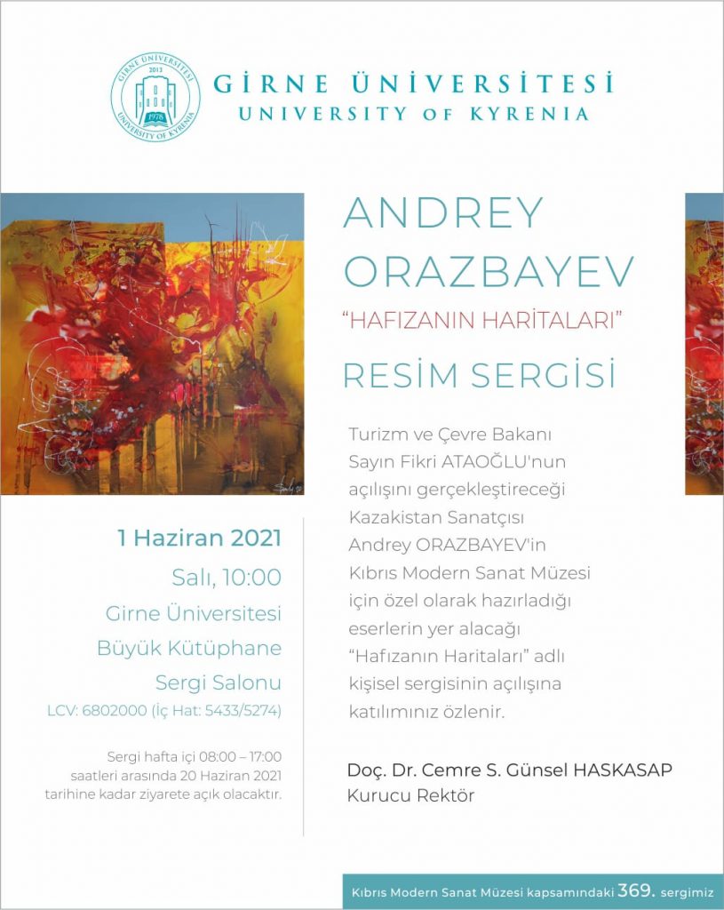 Kazak sanatçı Andrey Orazbayev’in, Kıbrıs Modern Sanat Müzesi için özel olarak hazırladığı “Hafızaların Haritası” adlı kişisel resim sergisi Turizm ve Çevre Bakanı Fikri Ataoğlu tarafından, 1 Haziran Salı günü saat 10:00’da, Girne Üniversitesi Büyük Kütüphane’de açılacak.