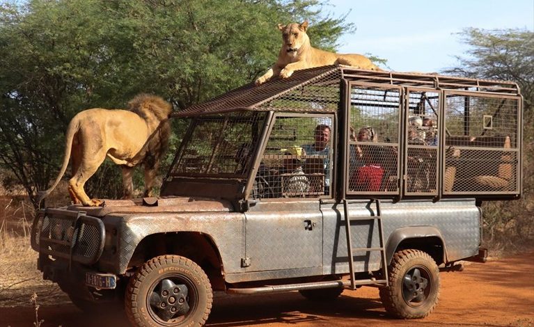 Senegal’de ziyaretçilerin, kafesli araçlara binerek açıkta dolaşan aslanlara yaklaşabildiği doğal yaşam parkı, farklı bir hayvanat bahçesi deneyimi sunuyor.