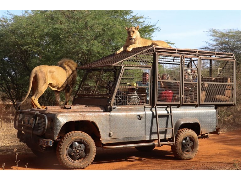 Özel dizayn edilmiş tellerle kaplı kafesli araçlara binen ziyaretçiler, yaklaşık 30 dakika süren turda, 5 hektarlık alanda özgürce dolaşan aslanlara yaklaşabiliyor, araçtaki küçük pencerelerden dokunabiliyor ve onlarla fotoğraf çektirebiliyor.