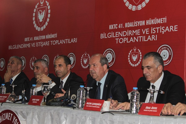 “Ülkeye Hizmet Yolunda Girne’deyiz” sloganıyla dün akşam GAÜ Milenyum Senato Kongre Merkezi’nde gerçekleştirilen toplantının başında, Başbakan Ersin Tatar ve Başbakan Yardımcısı ve Dışişleri Bakanı Kudret Özersay birer konuşma yaptı ardından da bakanlar vatandaşların sorularını yanıtlayarak, önerilerini dinledi.