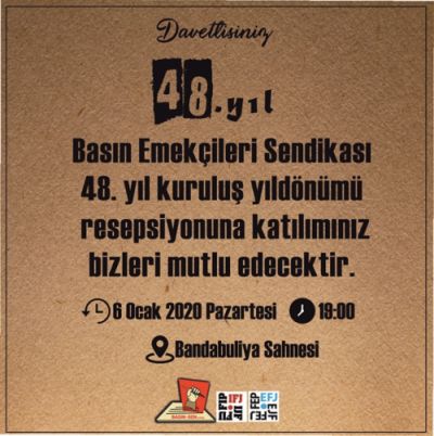 Basın Emekçileri Sendikası (Basın-Sen), kuruluşunun 48. yıldönümü nedeniyle Pazartesi resepsiyon veriyor.