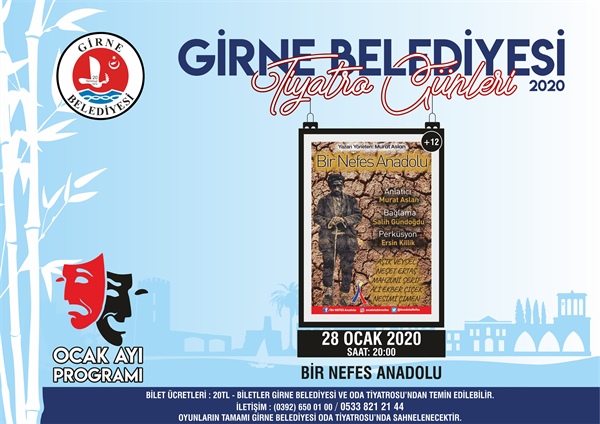 Girne Belediyesi’nin düzenlediği Tiyatro Günleri, Murat Aslan’ın yazıp yönettiği ve anlatıcı olarak yer aldığı “Bir Nefes Anadolu” adlı oyunla devam edecek.