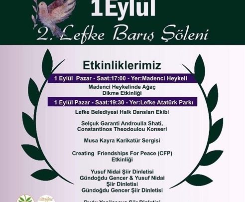 Bugün Lefke’de yapılacak 2. Barış Şöleni saat 17.00’de “Madenci Heykeli”nde ağaç dikme etkinliğiyle başlayacak. 19.30’da ise Lefke Atatük Parkı’nda Lefke Belediyesi Halk Dansları Ekibi’nin gösterisi, Selçuk Garanti, Androulla Shati ve Constantinos Theodoulu’nun konseri, Musa Kayra’nın karikatür sergisi, Creating Friendships for Peace etkinliği, Yusuf Nidai, Gündoğdu Gencer ve Dudu Yeşilceova’nın şiir dinletisi yer alacak. Barış Günü etkinliği, Grup Baria’nın konseriyle tamamlanacak.