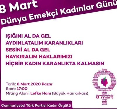 Cumhuriyetçi Türk Partisi( CTP) Kadın Örgütü, 8 Mart Dünya Emekçi Kadınlar Günü’nde Lefke Hanı’nda etkinlik düzenliyor.