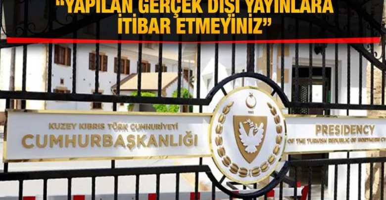 “Yıllar boyu verdiği millî mücadele sonucunda devlet olmanın erdemine erişen Kıbrıs Türkü’nün, egemen Kuzey Kıbrıs Türk Cumhuriyeti’nde özgürce ve güvenlik içerisinde yaşaması, Kıbrıs’ta olası bir antlaşmanın ise egemen eşit iki devletin iş birliğini öngörmesi dışında Cumhurbaşkanlığı olarak bir başka tezimizin olamayacağı herkesin malumudur. Herhangi bir kişinin sosyal medya paylaşımını Cumhurbaşkanlığı tüzel kişiliğiyle ilişkilendirmeye çalışan medya kurumlarının, halkın doğru ve tarafsız haber alma hakkına saygı göstermesini, medya etiği çerçevesinde davranmasını, çarpıtılmış veya gerçek dışı yayıncılıktan halkın ve devletimizin bir fayda sağlayamayacağını idrak etmesini arzu ederken; yapılan gerçek dışı yayınlara halkımızın itibar etmeyeceğine olan inancımızın altını çiziyoruz.”