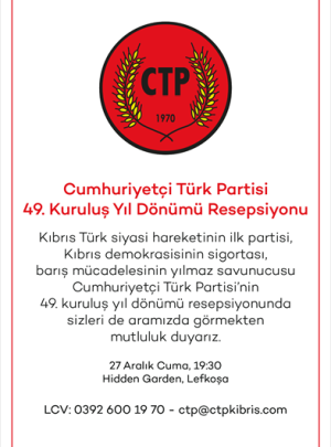 Açıklamada, “Kıbrıs Türk siyasi hareketinin ilk partisi, Kıbrıs demokrasisinin sigortası, barış mücadelesinin yılmaz savunucusu Cumhuriyetçi Türk Partisi’nin 49. kuruluş yıl dönümü resepsiyonunda sizleri de aramızda görmekten mutluluk duyarız” denildi.