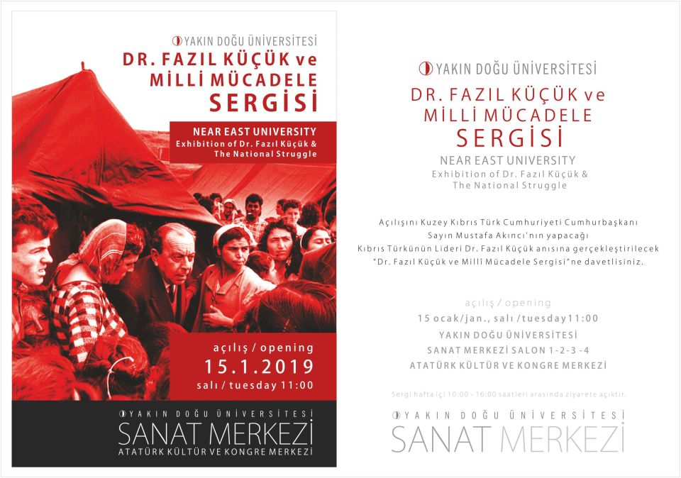 Yakın Doğu Üniversitesi Basın ve Halkla İlişkiler Müdürlüğü’nden yapılan açıklamaya göre, Kıbrıs Modern Sanat Müzesi’ne bağlı Atatürk Kültür Merkezi’nde bulunan Sanat Merkezi’nde yer alacak olan Dr. Fazıl Küçük ve Millî Mücadele sergisinin açılışı, 15 Ocak 2019 Salı günü saat 11.00’de, Cumhurbaşkanı Mustafa Akıncı tarafından yapılacak.