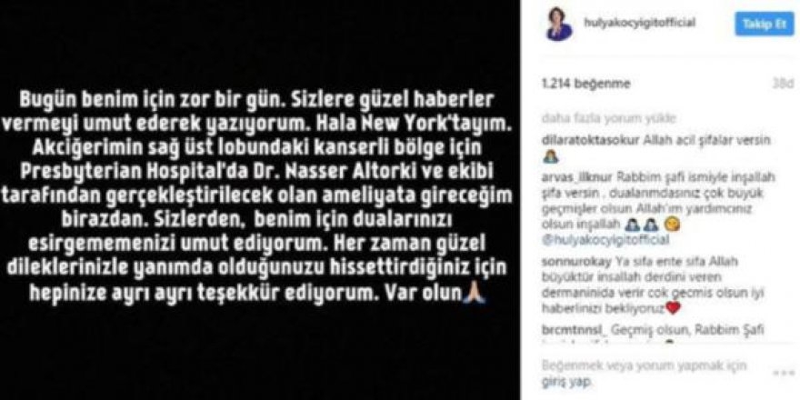 Üzücü haberi sosyal medyadan veren 69 yaşındaki ünlü sanatçı, “Bugün benim için zor bir gün. Sizlere güzel haberler vermeyi umut ederek yazıyorum. Halen New York’tayım. Akciğerimin sağ üst lobundaki kanserli bölge için Presbyterian Hospital’da Dr. Nasser Altorki ve ekibi tarafından gerçekleştirilecek ameliyata gireceğim birazdan. Sizlerden, benim için dualarınızı esirgememenizi umut ediyorum. Her zaman güzel dileklerinizle yanımda olduğunuzu hissettirdiğiniz için hepinize ayrı ayrı teşekkür ediyorum. Var olun’’ dedi.