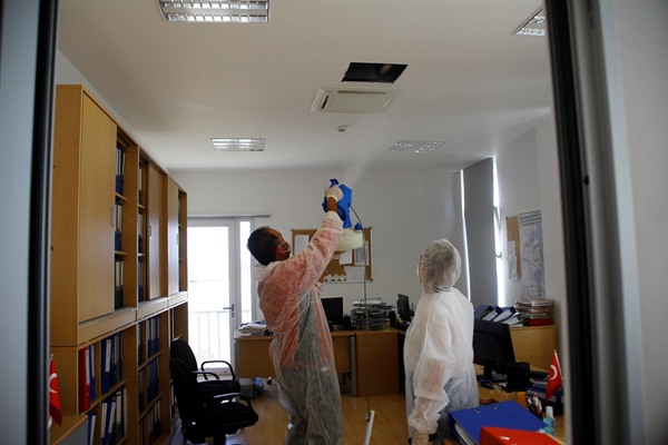 Gazimağusa Belediyesi Sağlık Şubesi ekipleri, koronavirüse karşı mücadele kapsamında, kent genelindeki toplu yaşam alanlarında ilaçlama yapıyor.