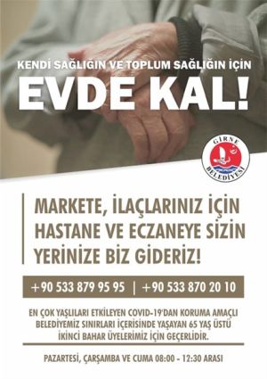 Girne Belediyesi Sosyal İşler Şubesi Ekiplerine +905338799595 ve +905338702010 numaralı telefonlardan ulaşılabilecek. Market ve Eczane alışverişleri Pazartesi, Çarşamba ve Cuma günü 08.00-12.30 saatleri arası gerçekleştirilecek.