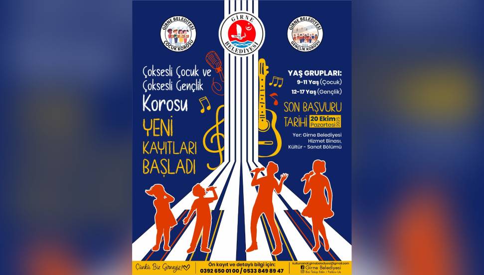 Girne Belediyesi’nin “Çok Sesli Çocuk” ve “Çok Sesli Gençlik Korosu” için yeni dönem kayıtları devam ediyor. Koroya katılmak isteyenler 20 Ekim Pazartesi gününe kadar başvuruda bulunabilir.