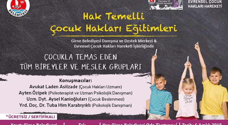 Girne Belediyesi Danışma ve Destek Merkezi ile Evrensel Çocuk Hakları Derneği işbirliğinde, “Hak Temelli Çocuk Hakları Eğitimleri” düzenleniyor.