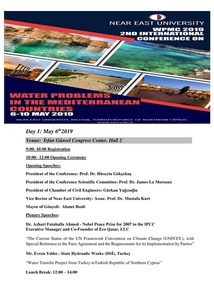 Açılış konuşmalarını sırasıyla, Konferans Başkanı Prof Dr Hüseyin Gökçekuş, Konferans Bilim Kurulu Başkanı; Prof Dr James La Moreaux, KTMMOB İnşaat Mühendisleri Odası Başkanı Gürkan Yağcıoğlu ,Yakın Doğu Üniversitesi Rektör Yardımcısı Doç. Dr. Mustafa Kurt ve Gönyeli Belediye Başkanı Ahmet Benli yapacak.