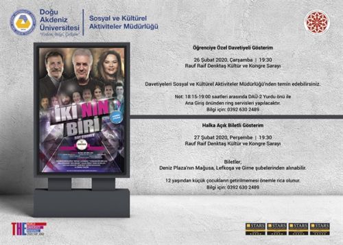 Doğu Akdeniz Üniversitesi (DAÜ) Sosyal ve Kültürel Aktiviteler Müdürlüğü’nün çalışmalarıyla “İkinin Biri” adlı 2 perdelik komedi oyunu 26 – 27 Şubat’ta Rauf Raif Denktaş Kültür ve Kongre Sarayı’nda sahnelenecek.