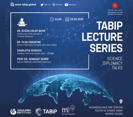 Türkiye Cumhuriyeti Cumhurbaşkanlığı himayelerinde Yunus Emre Enstitüsü tarafından yürütülen TABİP kapsamında, İstanbul Teknik Üniversitesi (İTÜ) Kuzey Kıbrıs Kampüsü ortaklığında 25 Şubat Salı günü Gazimağusa’da Rauf Raif Denktaş Kültür ve Kongre Sarayı Arsinoe Salonu’nda “Bilim Diplomasisi Konuşmaları” konulu seminer düzenleniyor.