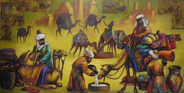 Kazak göçebelerinin tarihini, kültürünü ve geleneklerini anlatan resimleri içeren sergide, ana çalışma olarak 7 bölümden oluşan “Büyük İpek Yolu” panoraması eseridir. Eserde, Avrasya kıtasının halkını bir araya getiren Çin, Hindistan, Orta ve Küçük Asya, Avrupa ticaret yollarının içinden geçtiği kültürel bölgelerin yansımaları işlendi. Eserlerinde farklı teknikler kullanan ressam tuval üzerine resim, rölyef resim ve grafik kullanıyor.