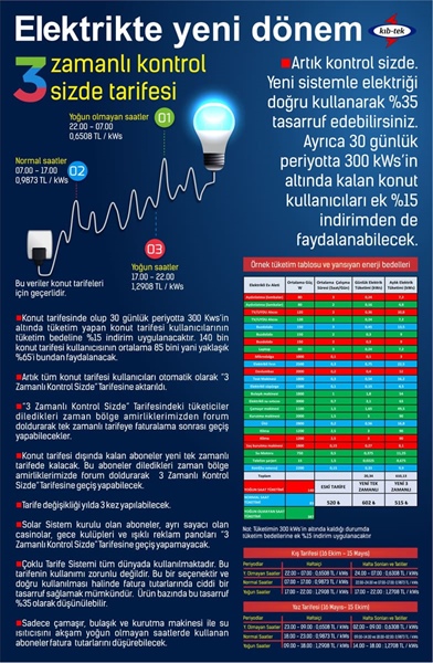 Üçlü tarifedeki “normal” saat diliminde enerjinin yüzde 43.4’ü; “yoğun” olarak adlandırılan ve pahalı olan saat diliminde yüzde 27.4’ü; “yoğun olmayan” olarak adlandırılan ve elektriğin en ucuz olduğu saatlerde ise enerjinin yüzde 29.2’sinin kullanıldığını hesaplayan KIB-TEK, üçlü tarifenin doğru anlaşılıp kullanılmasından duyduğu mutluluğu ifade etti.