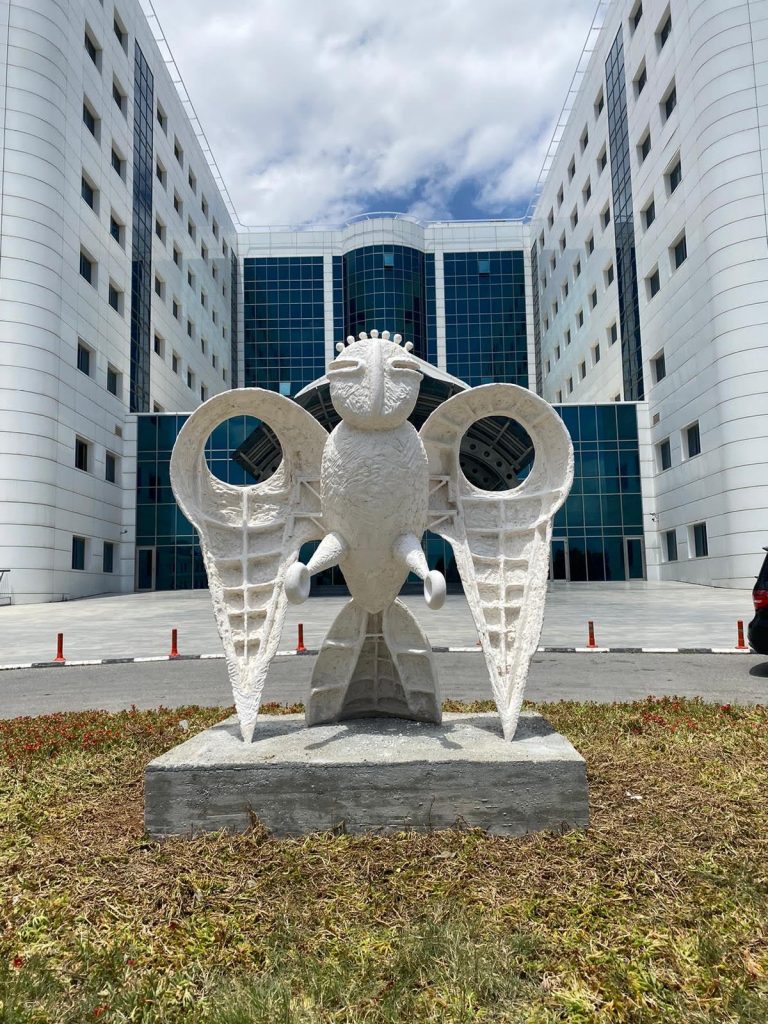 Yakın Doğu Üniversitesi Basın ve Halkla İlişkiler Müdürlüğü’nden verilen bilgiye göre, sanatçı Talgat Zhumagulov’a göre Yakın Doğu Üniversitesi Hastanesi önünde yerini alan ‘Baykuş’ heykeli simetrik bir kompozisyon olup, ana elemanlarının kanatlardaki delikler ve kuş başı olduğunu belirtti. Baykuş Türk göçebe halkının kutsal bir kuşudur diyen sanatçı, bu kuşun geceleri hareket ettiğini ve olağanüstü bir vizyona sahip olduğunu ayrıca insan hayatında bilgeliğin ve keskin vizyonun sembolü olduğunu ifade ediyor.