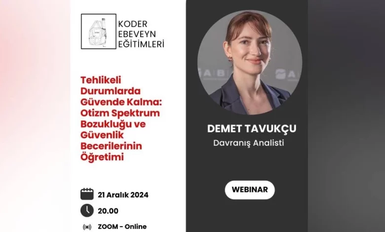 Davranış Analisti Demet Tavukçu tarafından verilecek eğitimde, “Tehlikeli Durumlarda Güvende Kalma: Otizm Spektrum Bozukluğu ve Güvenlik Becerilerinin Öğretimi” konusu ele alınacak.