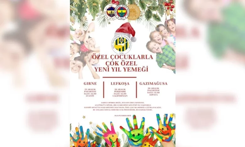 KKTC Fenerbahçeli İş İnsanları Derneği (KKTC FBİDER), Lefkoşa, Girne ve Gazimağusa’daki özel eğitim okullarında eğitim gören 210 özel çocuğa yeni yıl yemeği vereceğini açıkladı. Dernek, etkinlikler sırasında çocuklara hediyeler de takdim edecek.