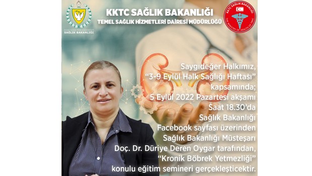 Sağlık Bakanlığı’nın 3-9 Eylül Halk Sağlığı Haftası dolayısıyla düzenlediği etkinlikler kapsamında, Sağlık Bakanlığı Müsteşarı Deren Oygar tarafından Kronik Böbrek Yetmezliği Semineri verilecek. Seminer, Sağlık Bakanlığı Facebook sayfasından çevrim içi olarak yapılacak.