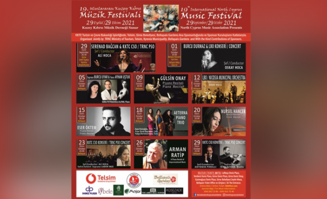 19. Uluslararası Kuzey Kıbrıs Müzik Festivali başlıyor. Kuzey Kıbrıs Müzik Derneği’nin düzenlediği Uluslararası Kuzey Kıbrıs Müzik Festivali, bu yıl 29 Eylül – 29 Ekim tarihleri arasında gerçekleştirilecek.