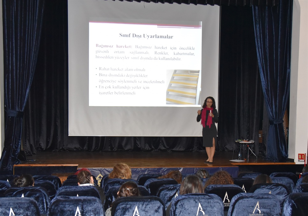 Uzman Bahar Üzümcü tarafından verilen seminerde, sınıf öğretmenlerine görme yetersizliği olan öğrencilerin okul hayatlarında yardımcı olacak, kolaylaştıracak ve derslere adaptasyonlarını sağlayacak pratik çözüm önerileri anlatıldı.