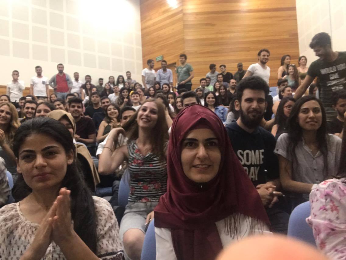 Söyleşiye eşi İmane El Bani ile katılan Murat Yıldırım, öğrenciler tarafından büyük coşku ve yoğun bir ilgiyle karşılandı.