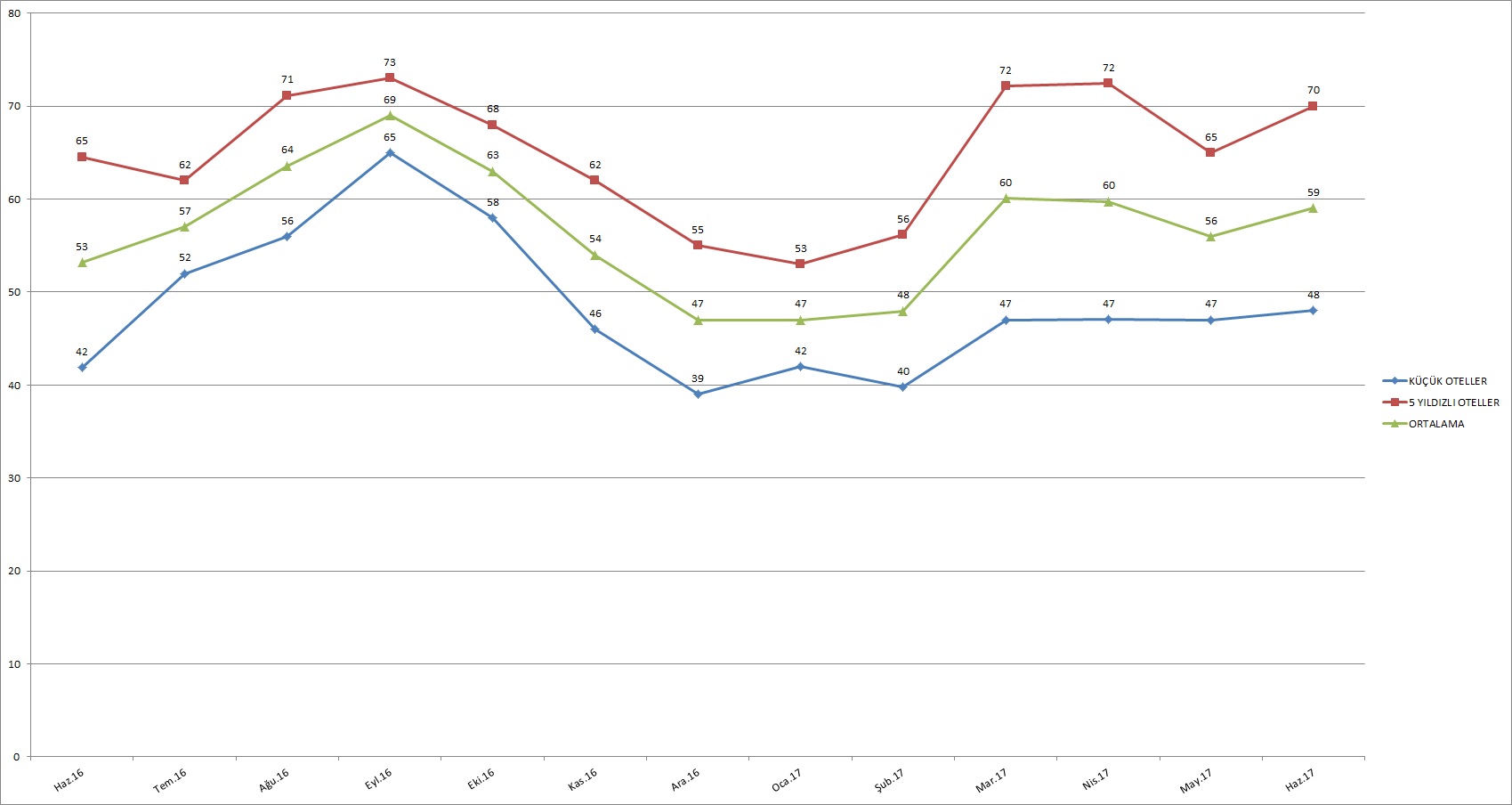 “5 yıldızlı büyük tesislerin dolulukları Haziran 2017 ayında %70 oranında oldu. Buna göre; 2016 yılının Haziran ayına göre %7’lik artış yaşarken, geçen Mayıs 2017 ayına göre de %7’lik bir artış yaşandı.
