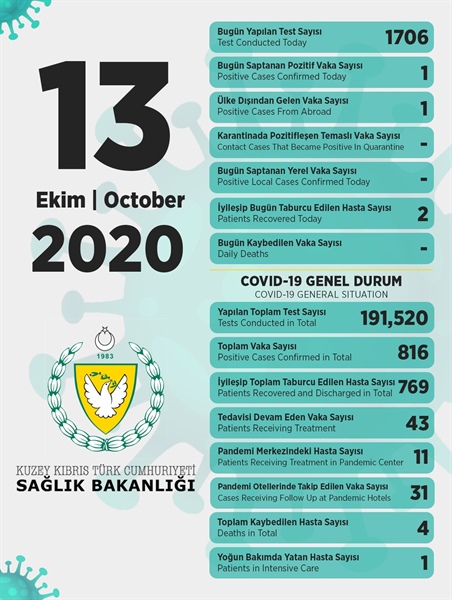 “Bugün yapılan test sayısı 1706. Bugün saptanan pozitif vaka sayısı 1. Ülke dışından gelen vakalar 1. Karantinada pozitifleşen temaslı vaka yok. Yerel vaka yok. İyileşip bugün taburcu edilen vaka sayısı 2. Bugün kaybedilen vaka yok. Yapılan toplam test sayısı 191 bin 520. Toplam vaka sayısı 816. İyileşip taburcu edilen toplam vaka sayısı 769. Tedavisi devam eden vaka sayısı 43. Pandemi merkezindeki hasta sayısı 11. Pandemi otellerinde takip edilen vaka sayısı 31. Toplam kaybedilen hasta sayısı 4. Yoğun bakımda yatan hasta sayısı 1”