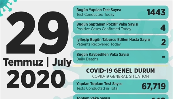 “Bugün yapılan test sayısı bin 443. Bugün saptanan pozitif vaka sayısı 4. İyileşip bugün taburcu edilen vaka sayısı 2. Bugün kaybedilen vaka yok. Yapılan toplam test sayısı 67 bin 719. Toplam vaka sayısı 142. İyileşip taburcu edilen vaka sayısı 111. Tedavisi devam eden vaka sayısı 27. Toplam kaybedilen hasta sayısı 4. Yoğun bakımda yatan hasta yok”