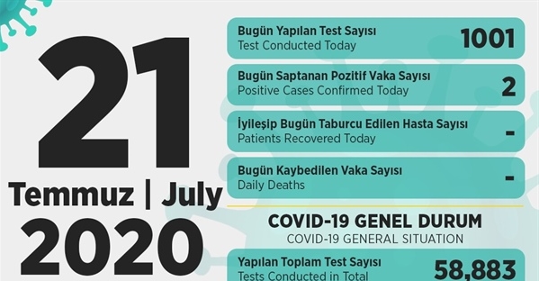 “Bugün yapılan test sayısı 1001. Bugün saptanan pozitif vaka sayısı 2. İyileşip bugün taburcu edilen vaka yok. Bugün kaybedilen vaka yok. Yapılan toplam test sayısı 58.883. Toplam vaka sayısı 125. İyileşip taburcu edilen toplam vaka sayısı 106. Tedavisi devam eden vaka sayısı 15. Toplam kaybedilen hasta sayısı 4. Yoğun bakımda yatan hasta yok”