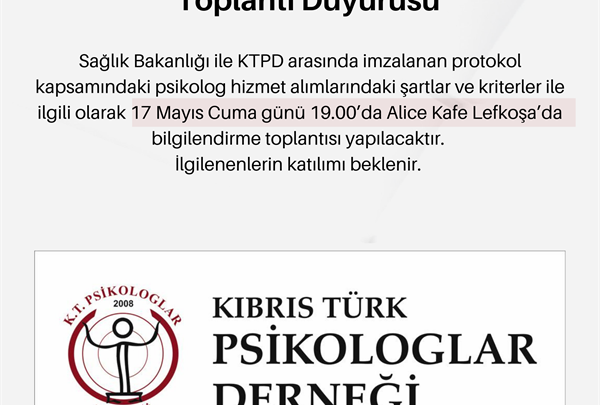 Kıbrıs Türk Psikologlar Derneği’nin Lefkoşa’da, Alice Cafe’de düzenleyeceği toplantıda, psikolog hizmet alımları şartları ve kriterleriyle ilgili bilgilendirme yapılacak. Toplantı saat 19.00’da başlayacak.