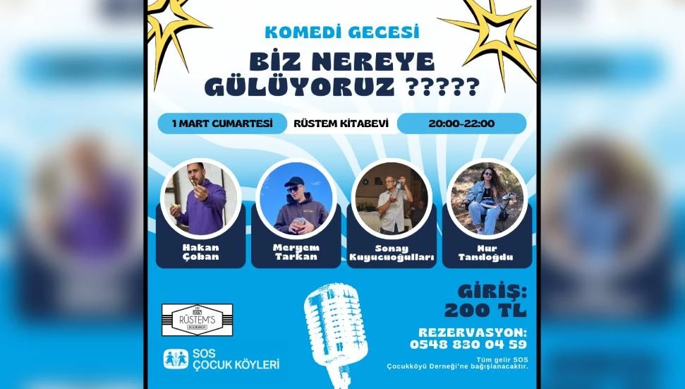 SOS Çocukköyü Derneği, Rüstem Kitabevi’nde 20.00-22.00 saatleri arasında gerçekleşecek Komedi Gecesi ile toplumsal meselelere farklı bir bakış açısı sunulacak. Mizahın gücüyle, zor konuların daha geniş kitlelere ulaşması hedefleniyor.