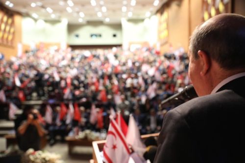 Başbakan Tatar’ın konuşması sırasında salonda KKTC ve TC bayrakları da sallandı.