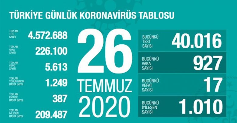 Türkiye’de son 24 saatte 927 kişiye Kovid-19 tanısı konuldu, 17 kişi hayatını kaybetti, toplam vaka sayısı 226 bin 100, can kaybı 5 bin 613 oldu.