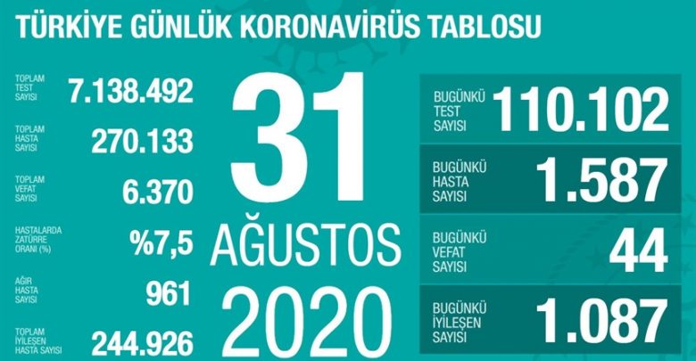 Türkiye’de son 24 saatte 1587 kişiye Kovid-19 tanısı konuldu, 44 kişi hayatını kaybetti, toplam vaka sayısı 270 bin 133, can kaybı 6 bin 370 oldu.