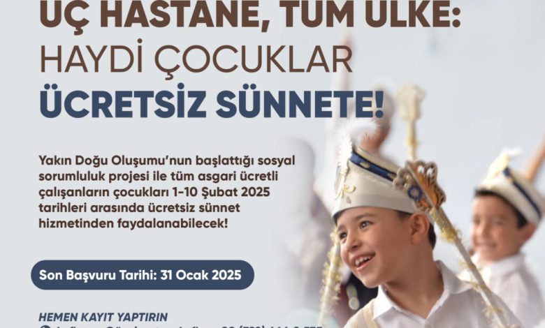 Yakın Doğu Oluşumu’nun başlattığı sosyal sorumluluk projesi ile asgari ücretli çalışanların çocukları ücretsiz olarak sünnet olacak. Yarıyıl tatilinde, 1-10 Şubat tarihlerinde geçerli olacak kampanyaya katılmak için son başvuru tarihi 31 Ocak!