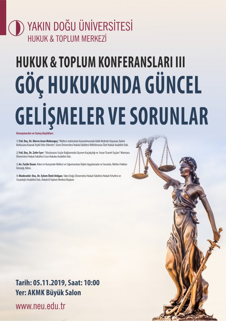 Yakın Doğu Üniversitesi Basın ve Halkla İlişkiler Müdürlüğü’nden verilen bilgiye göre, Hukuk ve Toplum Konferansları III – “Göç Hukukunda Güncel Gelişmeler ve Sorunlar” başlıklı konferans 05 Kasım 2019 Salı günü AKKM Büyük salonda saat 10.00’da başlayacak.