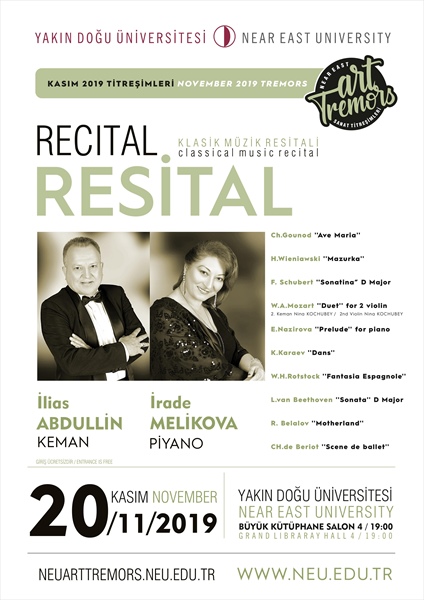 Yakın Doğu Üniversitesi Basın ve Halkla İlişkiler Müdürlüğü’nden verilen bilgiye gör,e kampus içerisinde her ay klasik sanat dallarında farklı etkinliklerin düzenleneceği Sanat Titreşimleri Kasım ayı etkinliğinde, İlias Abdullin ile İrade Melikova tarafından piyano ve kemandan oluşan Klasik Müzik Resitali sunulacak.