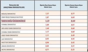 Yakın Doğu Üniversitesi Basın ve Halkla İlişkiler Müdürlüğü’nden yapılan açıklamada, Yakın Doğu Üniversitesi’nin 2018 yılında Öğretim Üyesi başına düşen makale sayısı 1.23, tam zamanlı Öğretim Elemanı başına düşen makale sayısının ise 0.64 oranında gerçekleştiği, bu rakamlarla Türkiye’deki Devlet ve Vakıf Üniversiteleri arasında “Üçüncü”, ülkemiz Üniversiteleri arasında ise “Birinci” sıraya taşındığı kaydedildi.