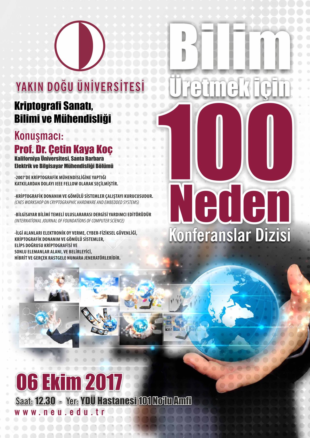 “Bilim Üretmek için 100 Neden” konferans dizisi 06 Ekim 2017 Cuma günü Kaliforniya Üniversitesinden ( University of California, Santa Barbara) Prof. Dr. Çetin Kaya Koç’un “The Art, Science and Engineering of Cryptography” başlıklı konferansıyla başlayacak.Konferans dizisi bilim yapmaya ve üretmeye değer veren tüm öğrencilere, akademisyenlere ve halkımıza açıktır.