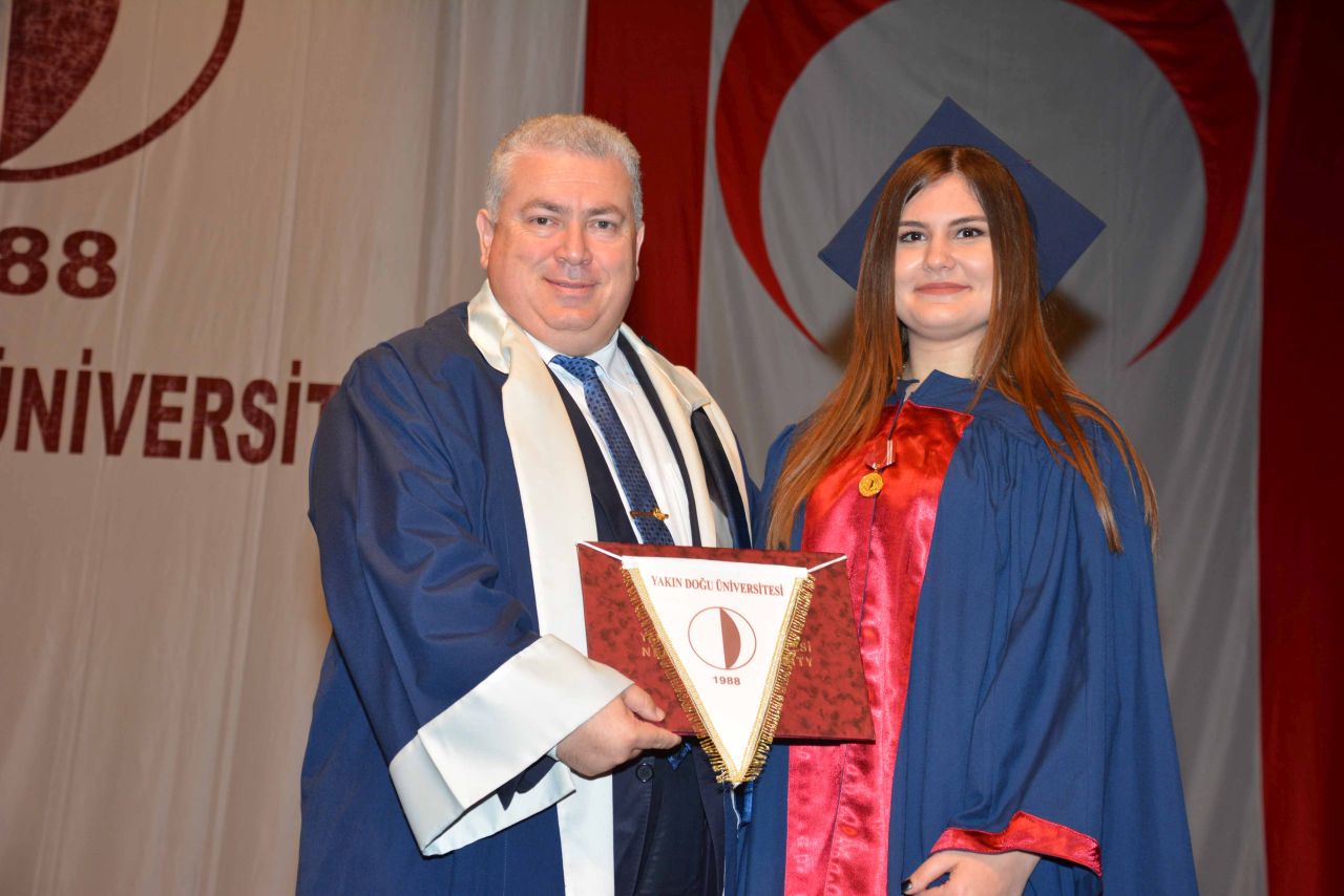 Törende, dereceye giren Fen Edebiyat Fakültesi birinci, ikinci ve üçüncüye şeref madalyaları ile  diplomalarını Yakın Doğu Üniversitesi Mütevelli Heyeti Başkanı Doç. Dr. İrfan S. Günsel takdim etti.