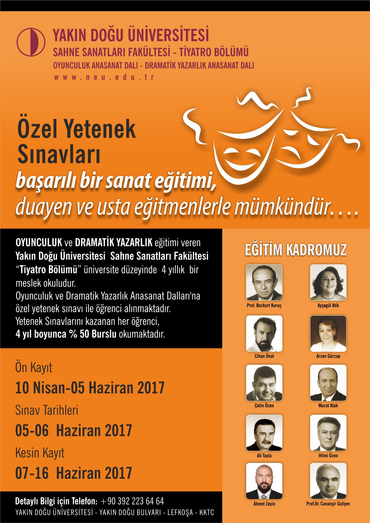 Yakın Doğu Üniversitesi Basın ve Halkla İlişkiler Müdürlüğü’nden verilen bilgiye göre, “Tiyatro Bölüm”ü Özel Yetenek Sınavı ile, Oyunculuk ve Dramatik Yazarlık Anasanat Dal’larına alınacak öğrenciler için kayıtların sürdüğü belirtildi. Özel Yetenek Sınavları, 05 – 06 Haziran – 2017 tarihlerinde YDÜ Sahne Sanatları Fakültesinde (Tıp Fakültesi Binası) yapılacaktır.